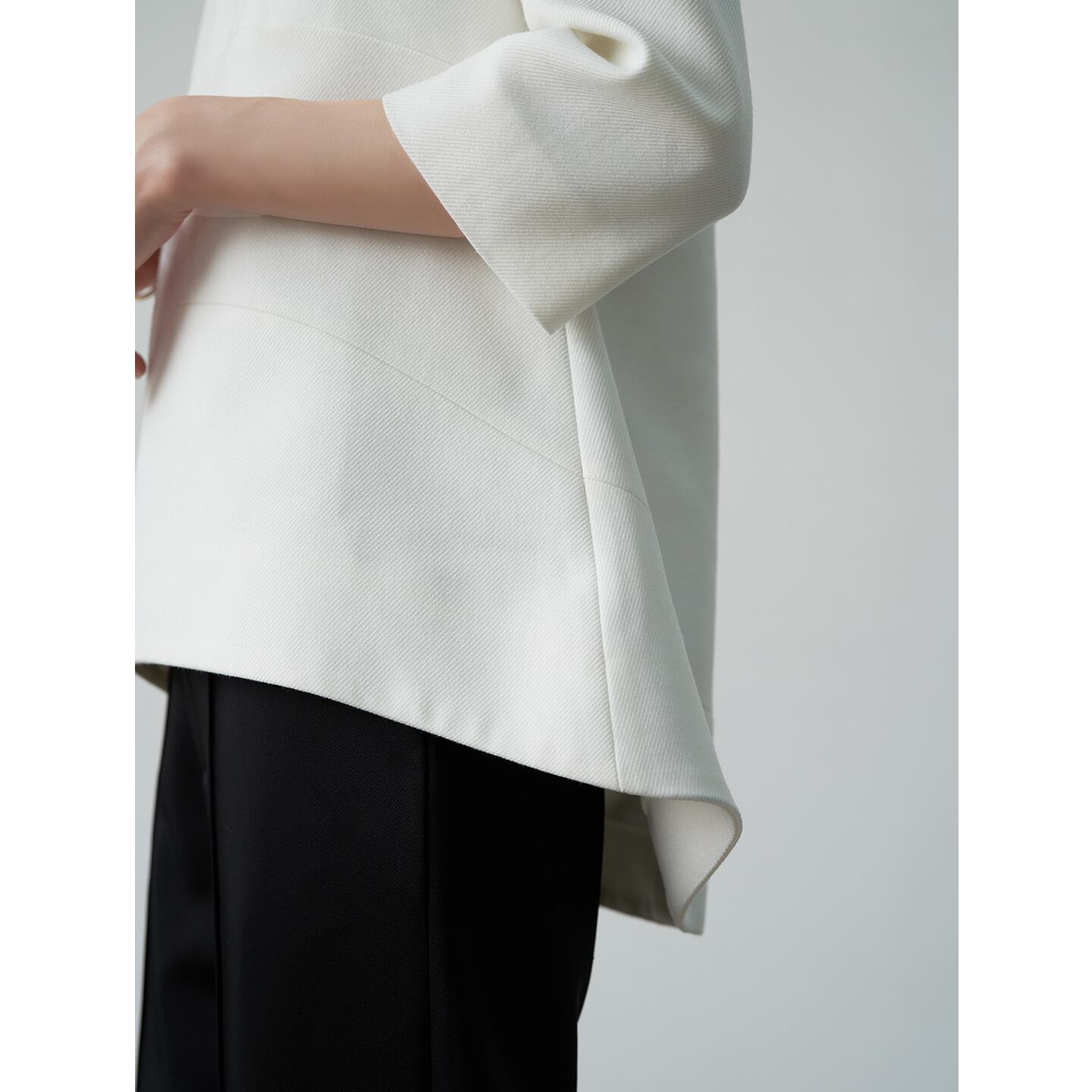 テーパードパンツやスティックパンツなどと合わせるとすっきりとした印象に。